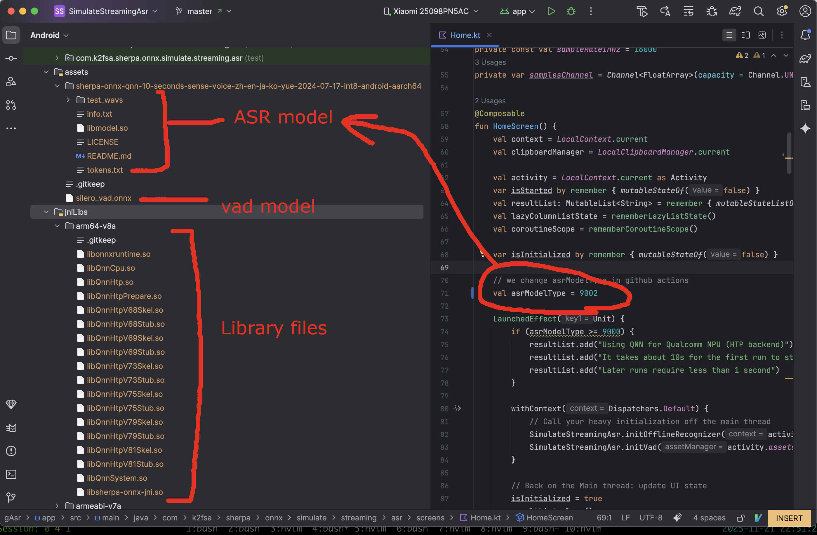 Use Android Studio to open https://github.com/k2-fsa/sherpa-onnx/tree/master/android/SherpaOnnxSimulateStreamingAsr